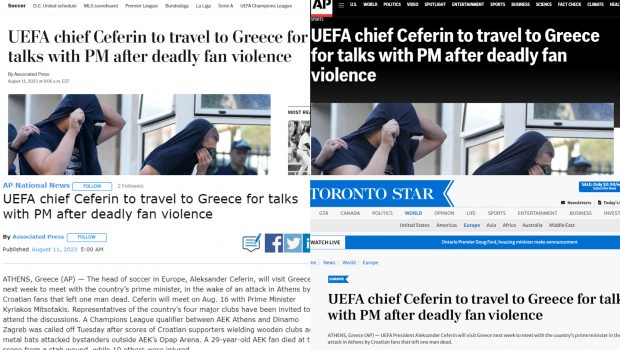 «Ο επικεφαλής της UEFA Αλεξάντερ Τσέφεριν θα ταξιδέψει στην Ελλάδα για συνομιλίες με τον πρωθυπουργό μετά τη θανατηφόρα βία από οπαδούς» γράφει το πρακτορείο ειδήσεων Associated Press, με την Washington Post να αναμεταδίδει την είδηση, κάνοντας παράλληλα αναφορά και στα επεισόδια που οδήγησαν στον θάνατο του Μιχάλη Κατσουρή.