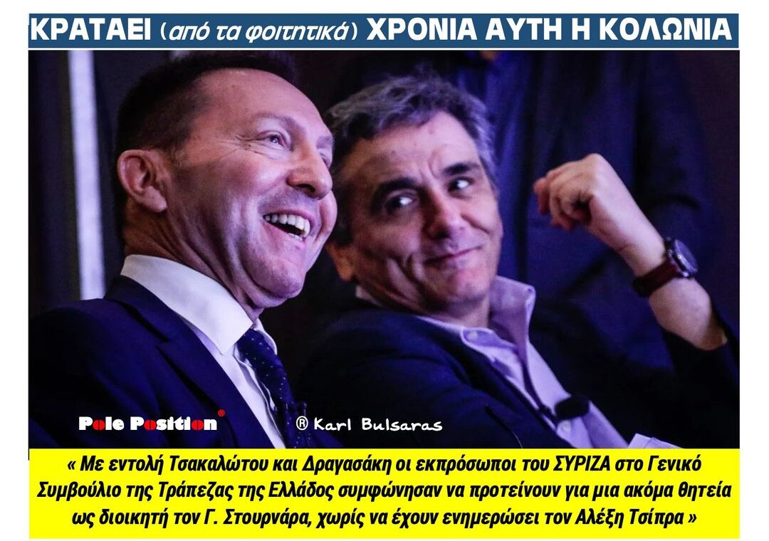 «Με εντολή Τσακαλώτου και Δραγασάκη οι εκπρόσωποι του ΣΥΡΙΖΑ στο Γενικό Συμβούλιο της Τράπεζας της Ελλάδος συμφώνησαν να προτείνουν για μια ακόμα θητεία ως διοικητή τον Γ. Στουρνάρα, χωρίς να έχουν ενημερώσει τον Αλέξη Τσίπρα».