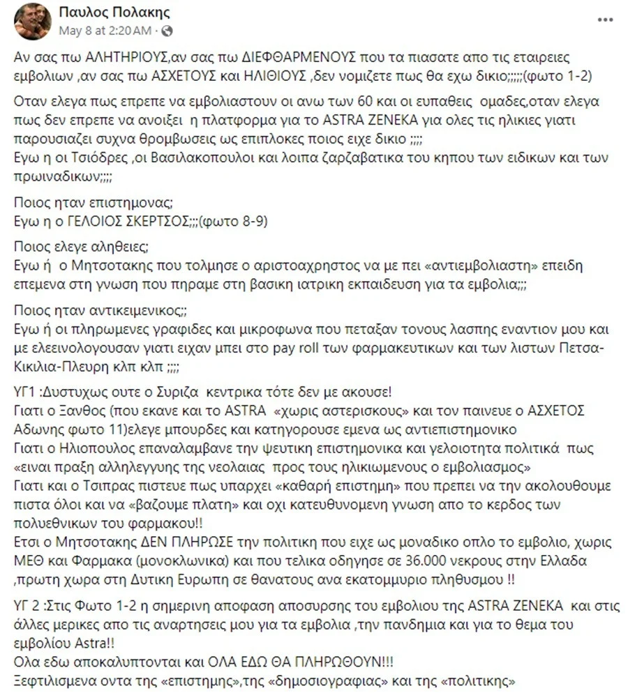 «Μετά τον μαλώσανε και το γύρισε τον σκοπό ο κ. Γεροτζιάφας, γιατί το εργαστήριο του στη Σορβόνη χρηματοδοτείται από τη Pfizer και προφανώς του διαμήνυσε ότι θα του κόψει τη χρηματοδότηση και το γύρισε και αυτός στο μοναδικό όπλο του εμβολίου», αφήνοντας μάλιστα υπαινιγμούς για «το πως γίνανε καθηγητές και τι τσάντες κουβαλήσανε».