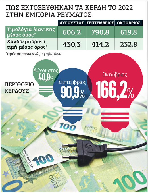 Και αυτό γιατί ενώ η τιμή χονδρεμπορικής τον Οκτώβριο ήταν στα 232,8 ευρώ, το κόστος στα τιμολόγια λιανικής έφτασε το ιλιγγιώδες 619,8 ευρώ. Δηλαδή οι εταιρείες αγόραζαν 232,8 ευρώ την μεγαβατώρα και την πωλούσαν στους καταναλωτές 619,8 ευρώ.