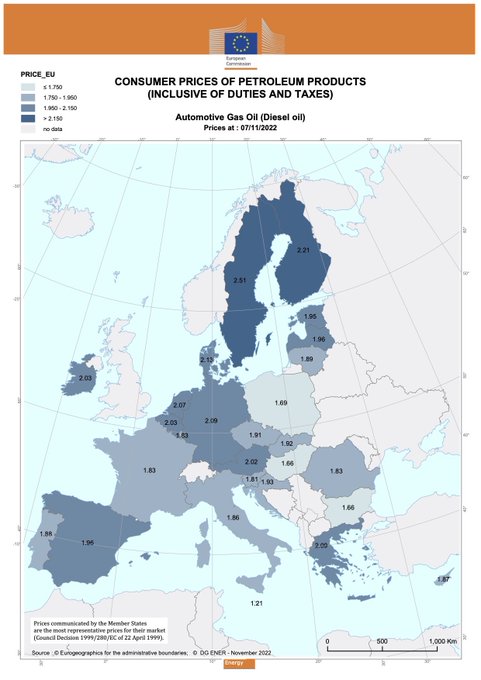 Αναφορικά με την τιμή του diesel, στην Ελλάδα κοστίζει 2,094 ευρώ ανά λίτρο, με τον μέσο όρο στα 27 κράτη να ανέρχεται σε 1,939 ευρώ.