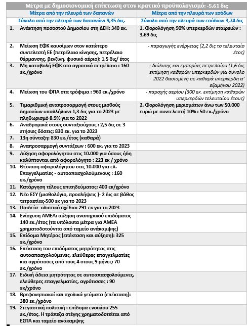 Το σύνολο από την πλευρά των δαπανών ανέρχεται σε 9,35 δις ευρώ ενώ από την πλευρά των εσόδων σε 3,74 δις ευρώ όπως παρουσιάζονται στον παρακάτω πίνακα. Συνεπώς, το Δημοσιονομικό Αποτέλεσμα ανέρχεται σε -5,61 δις.