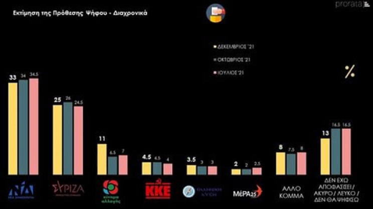 Η MRB παρουσίασε τις τάσεις του Δεκεμβρίου 2021 για την πολιτική κατάσταση στη χώρα, και στην πρόθεση ψήφου η ΝΔ προηγείται με διαφορά 11 % έναντι του ΣΥΡΙΖΑ.