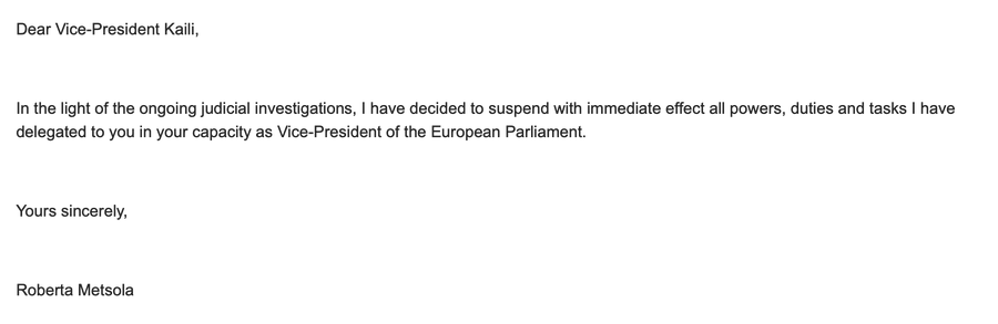 Η @EP_President Ρομπέρτα Μέτσολα με απόφαση της, που μόλις μας κοινοποιήθηκε, αναστέλλει-με άμεση εφαρμογή-όλες τις αρμοδιότητες που είχε αναθέσει στην Αντιπρόεδρο του @Europarl_EN Εύα #Καιλη. Επισπεύδονται οι διαδικασίες για την οριστική καθαίρεση της από το Προεδρείο του ΕΚ.