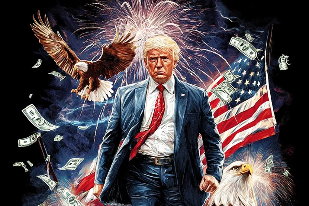 «Έξι μήνες. Μόνο γκάζι. Χωρίς φρένο. Η νίκη θα συνεχιστεί», συνεχίζει η λεζάντα κάτω από μια εικόνα προϊόν της τεχνητής νοημοσύνης με τον Ντόναλντ Τραμπ να περπατά αποφασιστικά μπροστά, με φόντο μια «βροχή» δολαρίων, την αστερόεσσα να κυματίζει και τον ίδιο πλαισιωμένο από δύο φαλακρούς αετούς, σύμβολο των ΗΠΑ.
