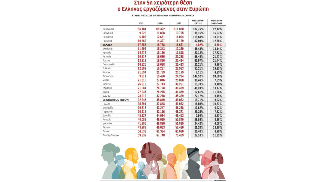Ποτέ ξανά τις τελευταίες 10ετίες δεν είχαμε τόσο μεγάλη διαφορά σε σχέση με τον μέσο όρο της Ε.Ε. Το 2013 η διαφορά ήταν 11.561 ευρώ (17.358 ευρώ η Ελλάδα και 28.919 ευρώ ο μέσος όρος της Ε.Ε.) και στο τέλος του 2022 η απόσταση έφτασε σε 18.668 ευρώ (16.661 ευρώ η Ελλάδα και 35.329 ευρώ η Ευρωζώνη). Χώρες που είχαν πολύ χαμηλότερες ετήσιες αποδοχές από την Ελλάδα (Σλοβακία, Κροατία, Λετονία, Τσεχία, Πορτογαλία, Εσθονία, Λιθουανία) πλέον έχουν ξεπεράσει τη χώρα μας και προσφέρουν καλύτερους μισθούς.