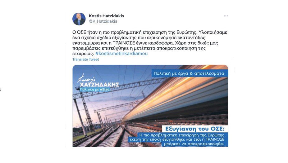Ειδικότερα, λίγες ημέρες πριν από τις εκλογές ο Κ. Χατζηδάκης πανηγύριζε σε ανάρτησή του για «το σχέδιο εξυγίανσης» που έκανε τον ΟΣΕ κερδοφόρο επί προηγούμενων κυβερνήσεων της ΝΔ, όταν ο ίδιος είχε αναλάβει το υπουργείο Μεταφορών. «Ο ΟΣΕ ήταν η πιο προβληματική επιχείρηση της Ευρώπης. Υλοποιήσαμε ένα σχέδιο εξυγίανσης που εξοικονόμησε εκατοντάδες εκατομμύρια και η ΤΡΑΙΝΟΣΕ έγινε κερδοφόρα. Χάρη στις δικές μας παρεμβάσεις επιτεύχθηκε η μετέπειτα αποκρατικοποίηση της εταιρείας» είχε γράψει χαρακτηριστικά. Σήμερα η πραγματικότητα ήρθε να διαψεύσει με τον χειρότερο τρόπο τον ίδιο και την παράταξή του, η οποία ως κυβέρνηση είχε γυρίσει επιδεικτικά την πλάτη στις καταγγελίες των εργαζομένων του κλάδου που τόνιζαν τη δραματική κατάσταση που επικρατεί στον ΟΣΕ σχετικά με την ασφάλεια και την ποιότητα των δρομολογίων.