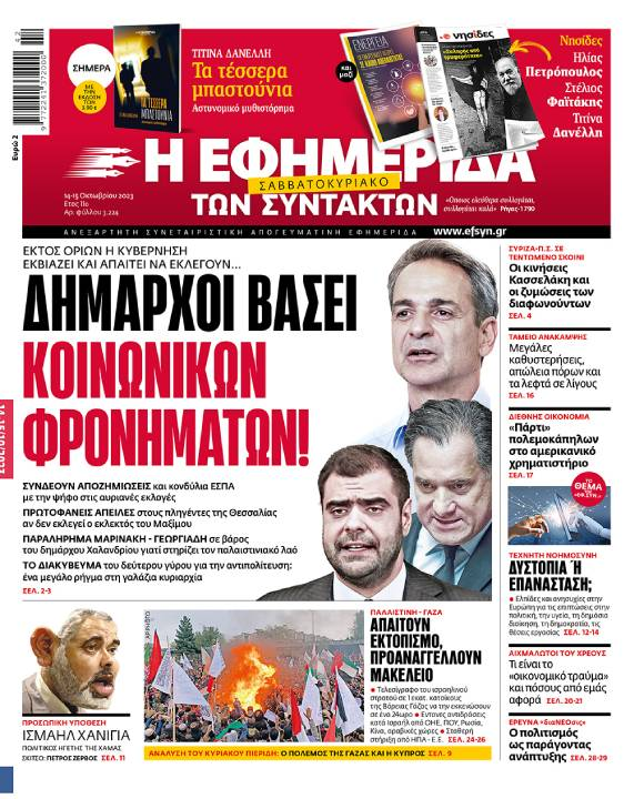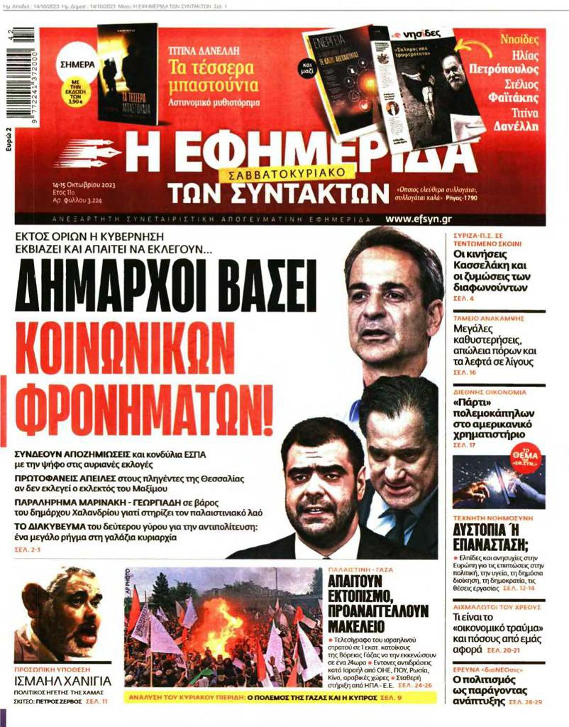 Η ΕΦ.ΣΥΝ. στο σημερινό της πρωτοσέλιδο, επισημαίνει των ωμό εκβιασμό της Ν.Δ. και την απαίτηση να εκλεγούν «Δήμαρχοι βάσει κοινωνικών φρονημάτων!».
