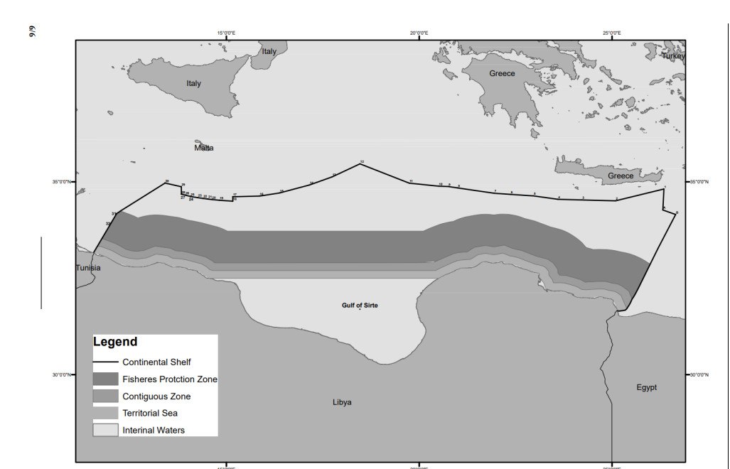 »Το σημείο 17 εκτείνεται νότια μέχρι το σημείο 18, όπου αρχίζουν τα όρια της υφαλοκρηπίδας μεταξύ Λιβύης και Μάλτας σύμφωνα με την απόφαση που εξέδωσε το Διεθνές Δικαστήριο το 1985 (Continental Shelf (Libyan Arab Jamahiriya Malta), η οποία εκτείνεται μέχρι το σημείο 28. Από εκεί, το θαλάσσιο όριο εκτείνεται βόρεια μέχρι το σημείο 29 και ακολουθεί τη μέση γραμμή μεταξύ της νήσου Σικελίας και της ηπειρωτικής Λιβύης μέχρι το σημείο 30.