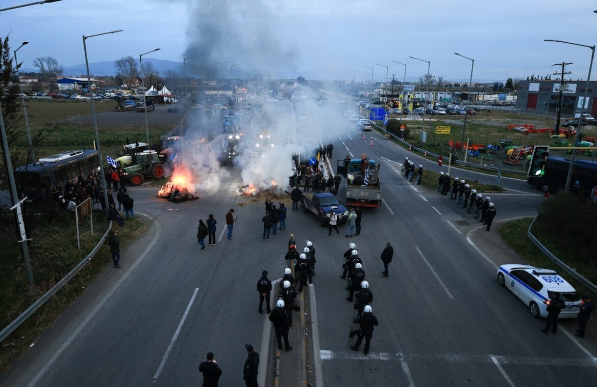 Διαμαρτυρία αγροτών στον κόμβο Πλατυκάμπου, Λάρισα, 7 Φεβρουαρίου 2024.