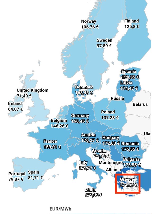 Η ακριβότερη αγορά, με τιμή στα 274,85 ευρώ/MWh όταν Βουλγαρία και Ιταλία, με τις οποίες κινούμαστε περίπου στα ίδια επίπεδα, έχουν τιμή χαμηλότερη σχεδόν κατά 100 ευρώ. Ισπανία και η Πορτογαλία σ με τιμές 81,71 ευρώ/MWh και 79,87 ευρώ/MWh. Ακρίβεια με υπογραφή Μητσοτάκη.