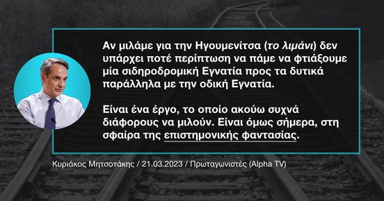 «Αν μιλάμε ας πούμε για την Ηγουμενίτσα δε θα γίνει αυτό, διότι δεν υπάρχει ποτέ περίπτωση να πάμε να φτιάξουμε μία σιδηροδρομική Εγνατία προς τα δυτικά παράλληλα με την οδική Εγνατία. Είναι ένα έργο, το οποίο το οποίο ακούω συχνά διάφορους να μιλούν. Είναι, όμως, σήμερα, στη σφαίρα της επιστημονικής φαντασίας» ανέφερε χαρακτηριστικά ο Κ. Μητσοτάκης.