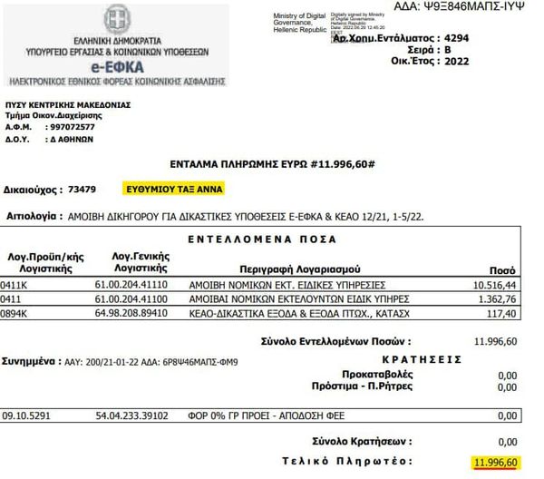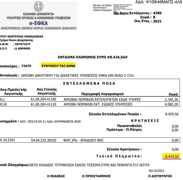 Η βουλευτής Θεσσαλονίκης Άννα Ευθυμίου παραβίαζε (αν και δικηγόρος) κι ΑΥΤΗ το Σύνταγμα, παρέχοντας νομικές υπηρεσίες σε σταθερή βάση προς τον ΕΦΚΑ. Συνολικό ποσό είσπραξης: 106.672€ (φωτό 3- 19)