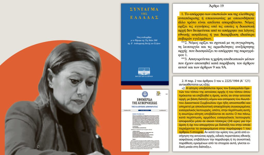 01, 02 Το Σύνταγμα της Ελλάδας προβλέπει με απόλυτη σαφήνεια ότι το απόρρητο της επικοινωνίας είναι απολύτως απαραβίαστο, εκτός από τις περιπτώσεις που μπορεί να γίνει άρση του για λόγους εθνικής ασφάλειας ή για τη διακρίβωση ιδιαίτερα σοβαρών εγκλημάτων. Οπως αποδεικνύεται όμως, στην Ελλάδα, στην οποία την τελευταία διετία έχουν γίνει σχεδόν 30.000 παρακολουθήσεις χωρίς να υπολογίζονται αυτές του 2022, ακόμη και ο ανώτατος νόμος της πολιτείας αντιμετωπίζεται σαν κουρελόχαρτο 03, 04 Ο νομοθέτης επιβάλλει μεν στον αποσπασμένο στην ΕΥΠ εισαγγελέα να αποφασίζει και να εγκρίνει ή να απορρίπτει τα αιτήματα παρακολούθησης, αλλά του δίνει περιθώριο 24 ωρών. Δηλαδή με δεδομένο ότι το 2021 είχαμε πάνω από 15.000 παρακολουθήσεις, η αρμόδια εισαγγελέας Βασιλική Βλάχου πρέπει να ενέκρινε περίπου 40 αιτήματα την ημέρα ακόμη κι αν εργαζόταν και τις 365 ημέρες του χρόνου χωρίς διάλειμμα