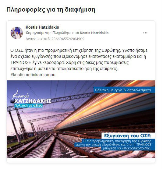 Συγκεκριμένα, τον Ιούλιο του 2019, λίγες ημέρες πριν από τις εκλογές, ο Κωστής Χατζηδάκης πανηγύριζε σε ανάρτησή του για «το σχέδιο εξυγίανσης» που έκανε τον ΟΣΕ κερδοφόρο επί προηγούμενων κυβερνήσεων της ΝΔ, όταν ο ίδιος είχε αναλάβει το υπουργείο Μεταφορών. Μάλιστα, η εν λόγω ανάρτηση έγινε και χορηγούμενη ώστε να φτάσει το… μήνυμα της ΝΔ σε πολλούς αποδέκτες, στο πλαίσιο της προεκλογικής καμπάνιας του.