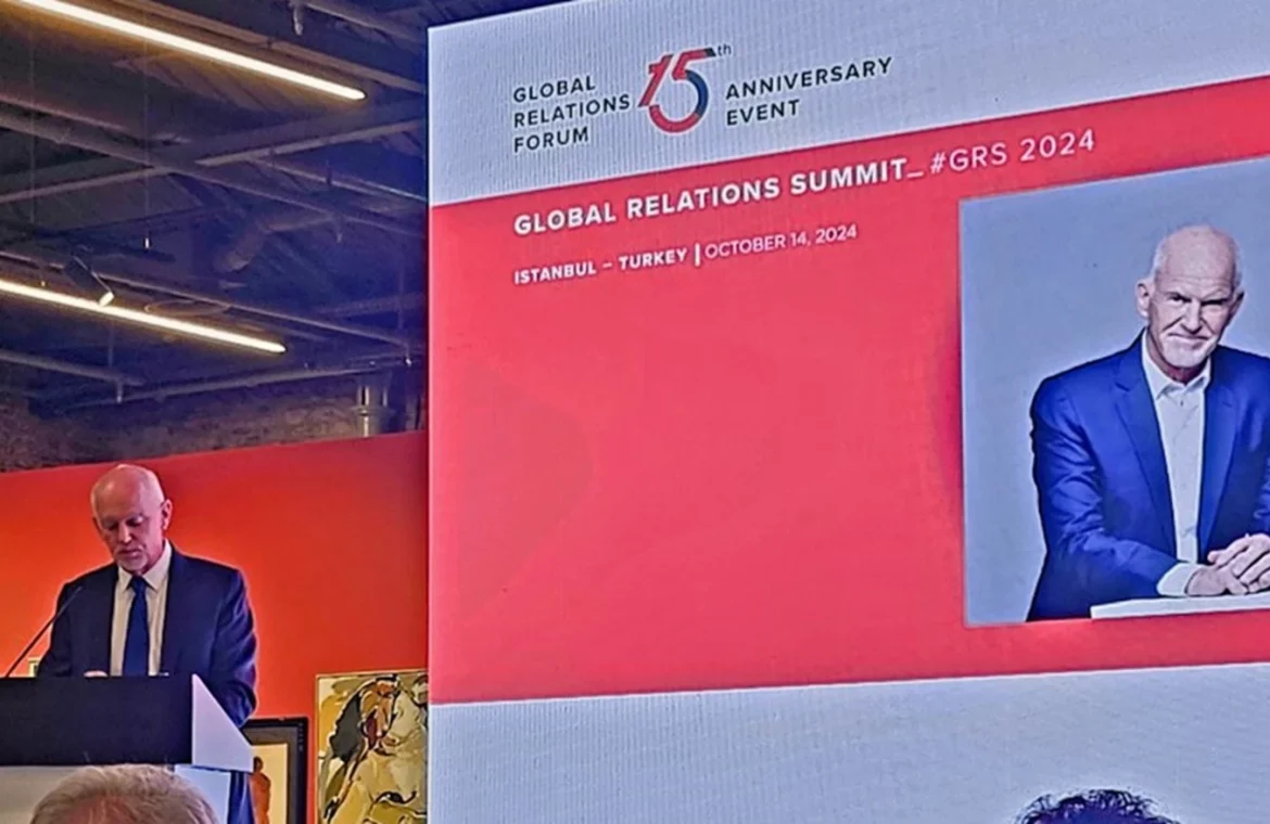 Ο πρώην πρωθυπουργός και νυν βουλευτής του ΠΑΣΟΚ-ΚΙΝΑΛ, Γιώργος Παπανδρέου, ήταν κεντρικός ομιλητής στο 15ο συνέδριο του «Φόρουμ Παγκόσμιων Σχέσεων» (Global Relations Forum), που πραγματοποιήθηκε στην Κωνσταντινούπολη στις 14 Οκτωβρίου, με κεντρικό θέμα «Πορεία σε ένα αβέβαιο, κοινό παγκόσμιο μέλλον».