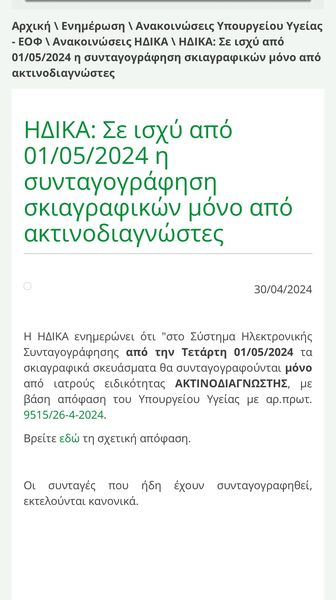 Παρε αμεσως πίσω αυτην την ΚΑΤΑΠΤΥΣΤΗ ΥΠΟΥΡΓΙΚΗ ΑΠΟΦΑΣΗ ,που επιβαλλει στους ασθενεις εκτος απο το γιατρο που τους συνταγογραφει την αξονική η τη μαγνητικη τομογραφια ,να κλεινουν ραντεβου και με ακτινολογο προκειμένου να τους γραψει ,το πολλες φορες απαραιτητο, ενδοφλεβιο σκιαγραφικο για τη σωστη εκτελεση της εξετασης!!!