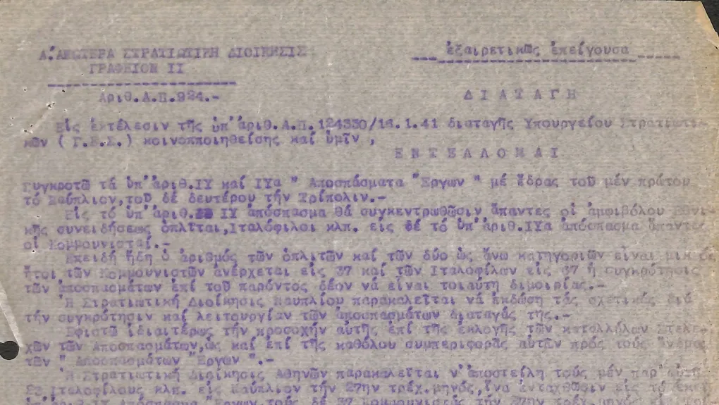 Τότε, όταν ξέσπασε ο πόλεμος οι κομμουνιστές και οι Αριστεροί από τις φυλακές και τις εξορίες- αλλά και όσοι ήταν ελεύθεροι- ζήτησαν να πάνε στο Μέτωπο. Η δικτατορία του Μεταξά όμως έκανε κάτι άλλο. Δημιουργήθηκαν από το στρατό δύο «αποσπάσματα έργων» (το ένα με έδρα το Ναύπλιο και το άλλο με έδρα την Τρίπολη) για να συγκεντρωθούν, όπως έλεγε η σχετική διαταγή, «οι αμφιβόλου εθνικής συνειδήσεως οπλιται». Στο ένα απόσπασμα συγκεντρώθηκαν όλοι οι ιταλόφιλοι κλπ και στο άλλο οι κομμουνιστές.