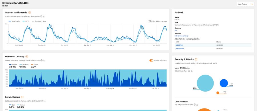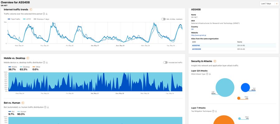Σύμφωνα με το cloudflare radar, που καταγράφει σε παγκόσμιο επίπεδο τις επιθέσεις DDoS ως DDoS mitigation provider, σχετικά με την υποδομή του GRNET με AS 5408 ΔΕΝ βλέπουμε την γιγάντια κυβερνοεπίθεση τις τελευταίες ημέρες. Βλέπουμε όμως spikes 25/5