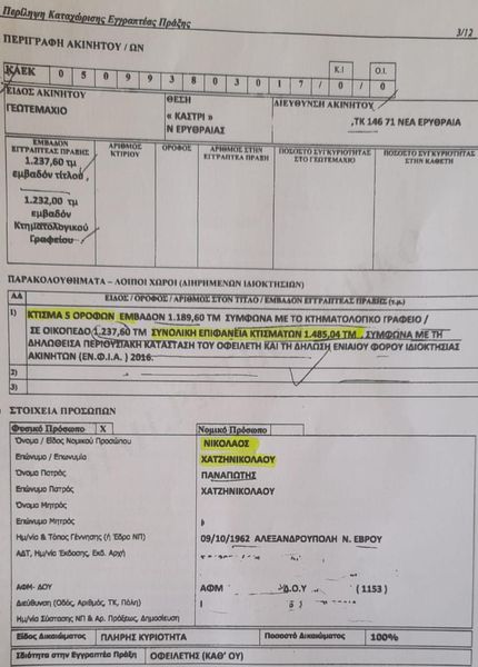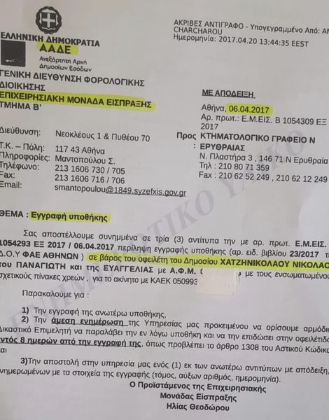 «Το 2017 η ΑΑΔΕ προέβη σε εγγραφή υποθήκης στην κατοικία, επιφανείας 1.485 τ.μ, του Ν. Χατζηνικολάου για χρέη προς το Δημόσιο» ύψους 3.6 εκατ.