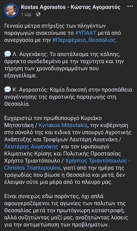 Συγκεκριμένα ο Υπουργός Αγροτικής Ανάπτυξης, Λευτέρης Αυγενάκης, σε δηλώσεις του από την περιοχή, συνέδεσε τις αποζημιώσεις και τα ευρύτερα μέτρα στήριξης με την επανεκλογή του απερχόμενου Περιφερειάρχη Κ. Αγοραστού: «Το αποτέλεσμα της κάλπης είναι ευνόητο ότι είναι άρρηκτα συνδεδεμένο με την ταχύτητα και την τήρηση των χρονοδιαγραμμάτων που μόλις εξαγγείλαμε»[1].