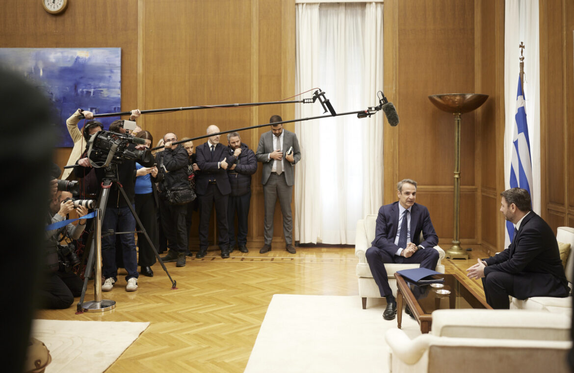 Συνάντηση του Πρωθυπουργού Κυριάκου Μητσοτάκη και του προέδρου του ΠΑΣΟΚ Νίκου Ανδρουλάκη στη Βουλή. 4 Δεκεμβρίου 2024.