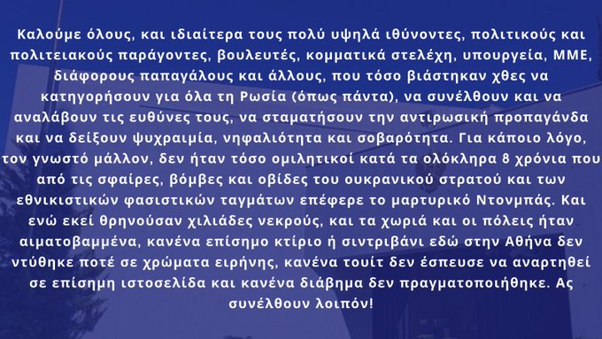 Για κάποιο λόγο, τον γνωστό μάλλον, δεν ήταν τόσο ομιλητικοί κατά τα ολόκληρα 8 χρόνια που από τις σφαίρες, βόμβες και οβίδες του ουκρανικού στρατού και των εθνικιστικών φασιστικών ταγμάτων επέφερε το μαρτυρικό Ντονμπάς. Και ενώ εκεί θρηνούσαν χιλιάδες νεκρούς, και τα χωριά και οι πόλεις ήταν αιματοβαμμένα, κανένα επίσημο κτίριο ή σιντριβάνι εδώ στην Αθήνα δεν ντύθηκε ποτέ σε χρώματα ειρήνης, κανένα τουίτ δεν έσπευσε να αναρτηθεί σε επίσημη ιστοσελίδα και κανένα διάβημα δεν πραγματοποιήθηκε. Ας συνέλθουν λοιπόν!