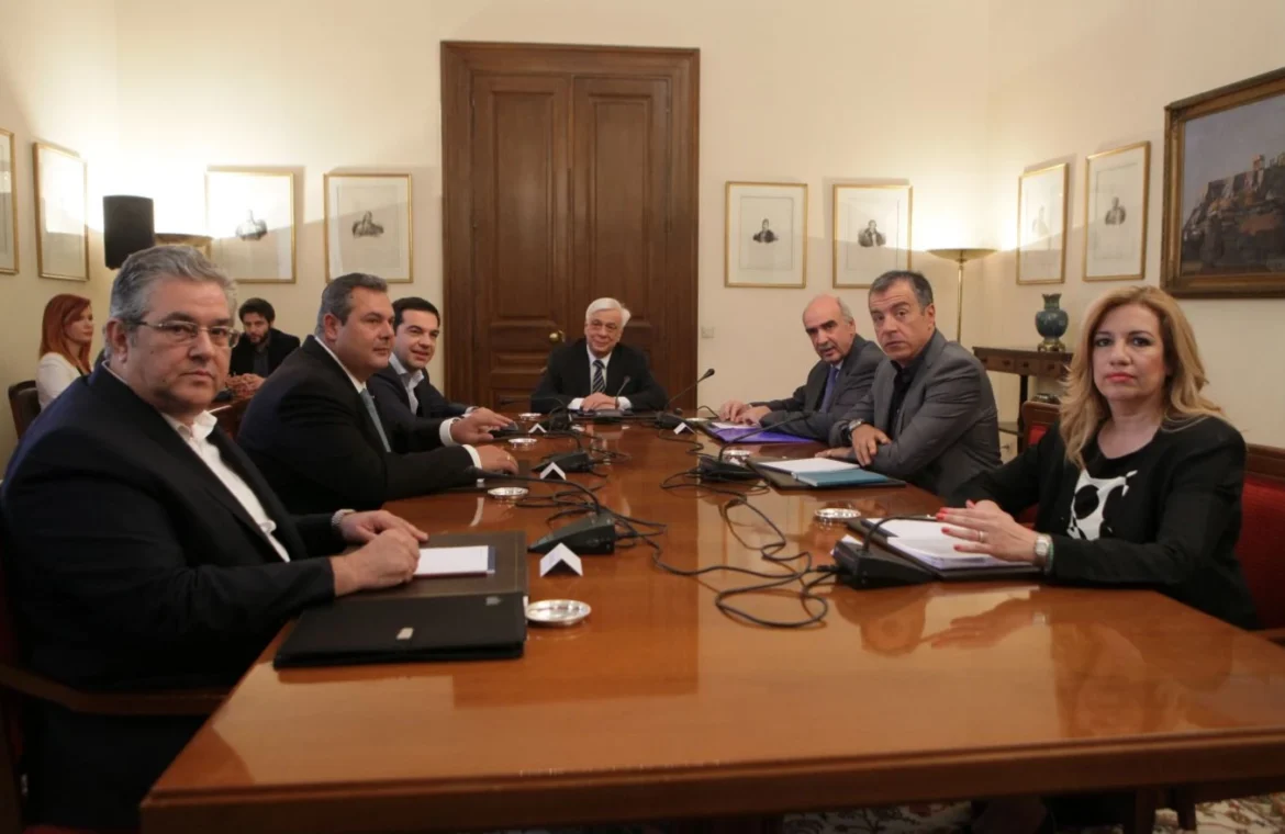 Η συνάντηση έγινε στο Προεδρικό Μέγαρο με πρωτοβουλία του τότε πρωθυπουργού Αλέξη Τσίπρα και υπό την προεδρία του Προκόπη Παυλόπουλου, ο οποίος επιχείρησε να διαμορφώσει ένα κοινό μέτωπο των πολιτικών δυνάμεων, ενόψει της νέας διαπραγματευτικής φάσης με τους θεσμούς, όπως είχε μετονομάσει η συγκυβέρνηση ΣΥΡΙΖΑ – ΑΝΕΛ την τρόικα. Στην κρίσιμη αυτή συνεδρίαση συμμετείχαν όλοι οι αρχηγοί των κοινοβουλευτικών κομμάτων, δηλαδή ο μεταβατικός πρόεδρος της Νέας Δημοκρατίας, Βαγγέλης Μεϊμαράκης, η πρόεδρος του ΠΑΣΟΚ, Φώφη Γεννηματά, ο γενικός γραμματέας του ΚΚΕ, Δημήτρης Κουτσούμπας, ο επικεφαλής του Ποταμιού, Σταύρος Θεοδωράκης, και ο πρόεδρος των ΑΝΕΛ και υπουργός Εθνικής Άμυνας, Πάνος Καμμένος.