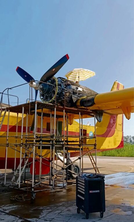 Στη φωτογραφία, στη βάση των πυροσβεστικών αεροσκαφών ένα Canadair επιδιορθώνεται στην πίστα του αεροδροµίου. Η θερµοκρασία στην περιοχή της Ελευσίνας είναι 38 βαθµοί Κελσίου και στην πίστα του αεροδροµίου αγγίζει τους 42o Kελσίου. Οι φωτιές φυσικά είναι σε εξέλιξη, αλλά ένας µηχανικός, υπό την προστασία µιας οµπρέλας θαλάσσης, κάτω από άθλιες συνθήκες, προσπαθεί να µετατρέψει το Canadair σε ικανό για πτήση.