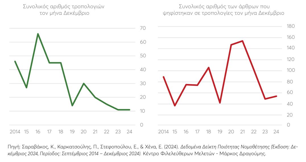 Η τάση της πρόχειρης νομοθέτησης εντοπίζεται και τον Δεκέμβριο του 2024 με τροπολογίες που περιλαμβάνουν άσχετες μεταξύ τους και άσχετες ως προς τον νόμο που προσαρτώνται διατάξεις, πρακτική που αντίκειται ξεκάθαρα στα οριζόμενα από το Σύνταγμα. Συγκεκριμένα, ψηφίστηκαν 11 τροπολογίες με συνολικά 65 άρθρα και μόνο 1 από αυτές ήταν σχετική με τον νόμο στον οποίο ψηφίστηκε.