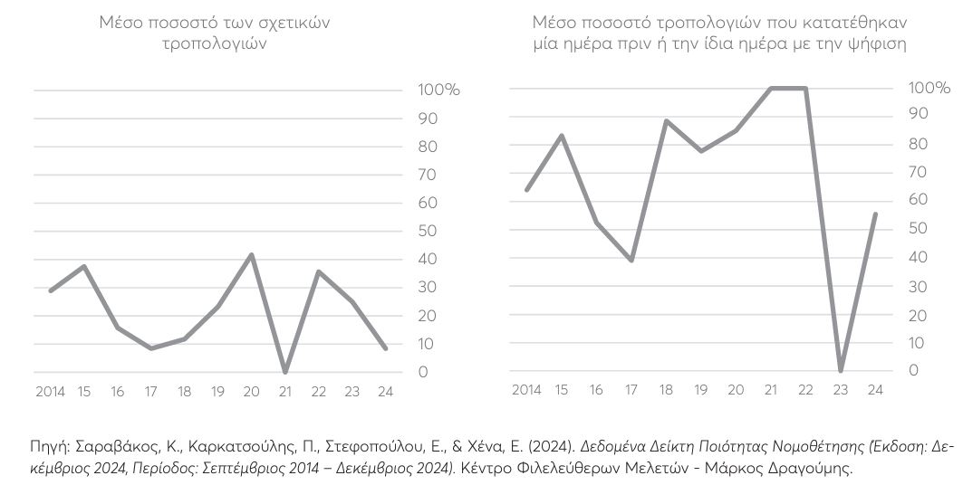 Σχετικά με τον χρόνο κατάθεσης των τροπολογιών του Δεκεμβρίου, τον Δεκέμβριο του 2020 και τον Δεκέμβριο του 2021 το ποσοστό των τροπολογιών που κατατέθηκαν μία ημέρα πριν ή την ίδια ημέρα με την ψήφιση ήταν 73% και 85% αντίστοιχα. Τον Δεκέμβριο του 2022 το σχετικό ποσοστό έπεσε στο 27% και το 2023 δεν υπήρξαν τροπολογίες της τελευταίας στιγμής, ενώ το 2024 το 64% των τροπολογιών που ψηφίστηκαν κατατέθηκαν μία ημέρα πριν ή την ίδια ημέρα με την ψήφιση τους.