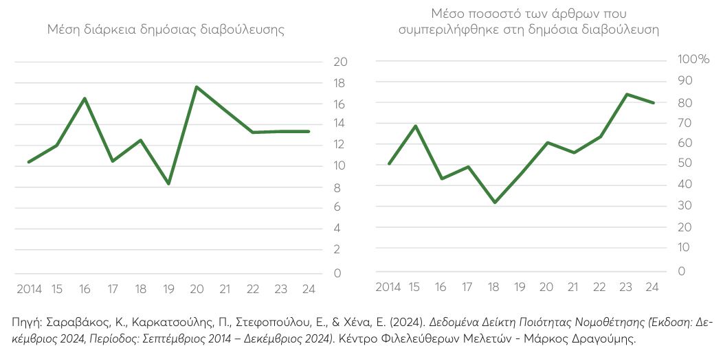 Στο πεδίο της δημόσιας διαβούλευσης, η νομοθέτηση τον μήνα Δεκέμβριο παρέμεινε σχετικά σταθερή, κοντά στους μέσους όρους του έτους. Η μέση διάρκεια της δημόσιας διαβούλευσης για τους νόμους που ψηφίστηκαν τον Δεκέμβριο του 2024 ήταν 13 ημέρες, χωρίς μεταβολή σε σχέση με τους Δεκεμβρίους του 2022 και 2023. Κατά μέσο όρο, οι νόμοι που ψηφίστηκαν τον Δεκέμβριο του 2024 μπήκαν σε δημόσια διαβούλευση κατά 80%, συνεχίζοντας την ανοδική τάση που παρατηρείται από το 2018