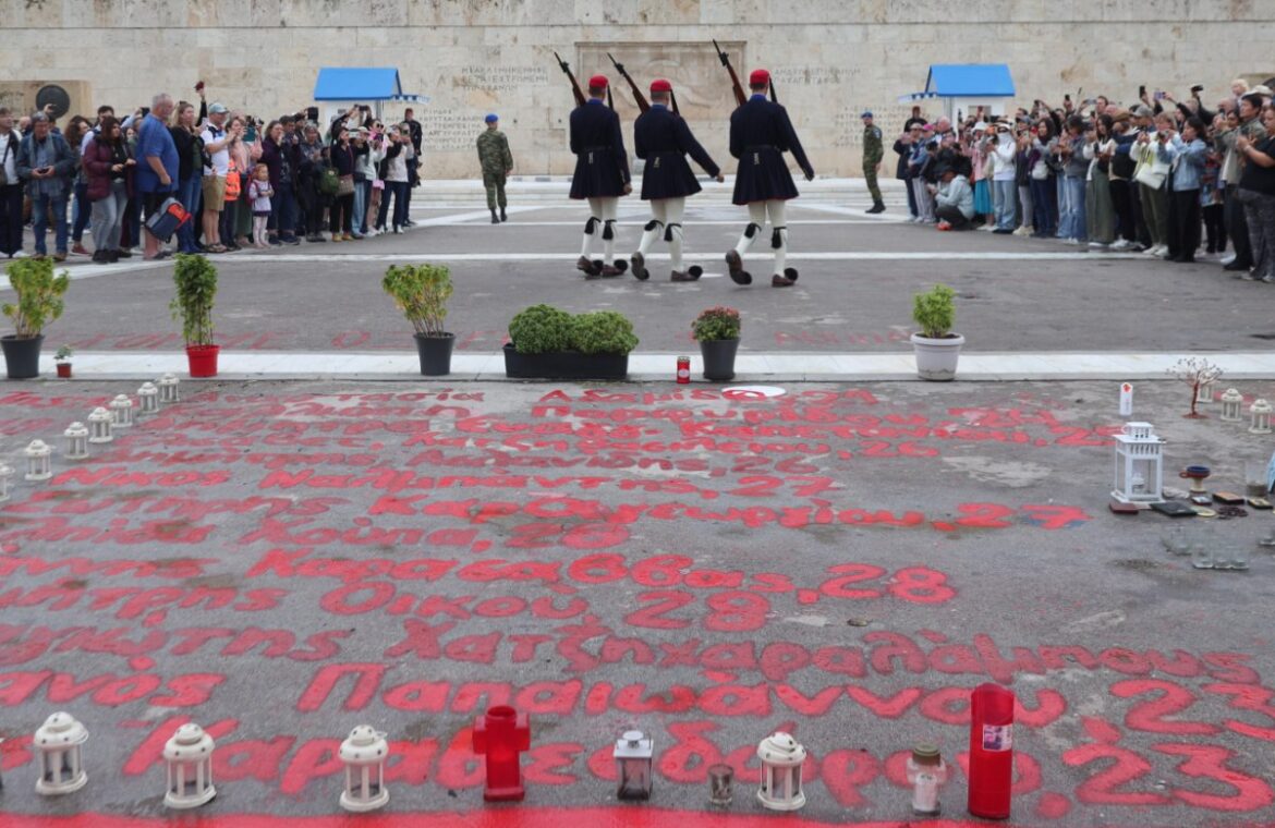 Τα ονόματα των 57 θυμάτων της τραγωδίας έχουν γραφτεί με κόκκινη μπογιά στο κράσπεδο της πλατείας και αποτελεί το σημείο διαμαρτυρίας και διεκδίκησης για την απόδοση ευθυνών και δικαιοσύνης.