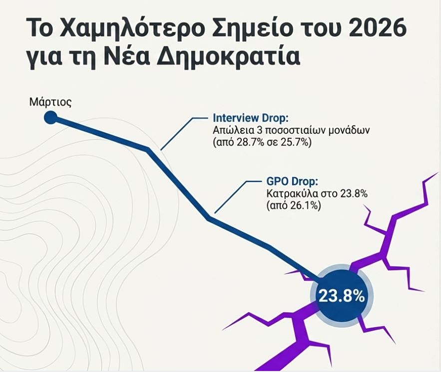 Τέλος, στη δημοσκόπηση της GPO για τα Παραπολιτικά που διεξήχθη μεταξύ 20-23 Απριλίου και δημοσιεύτηκε την 25η Απριλίου το κυβερνών κόμμα στην πρόθεση ψήφου κατρακυλά στο 23,8% από το 26,1% τον Μάρτιο (-2,3%), στο χαμηλότερο σημείο του 2026.