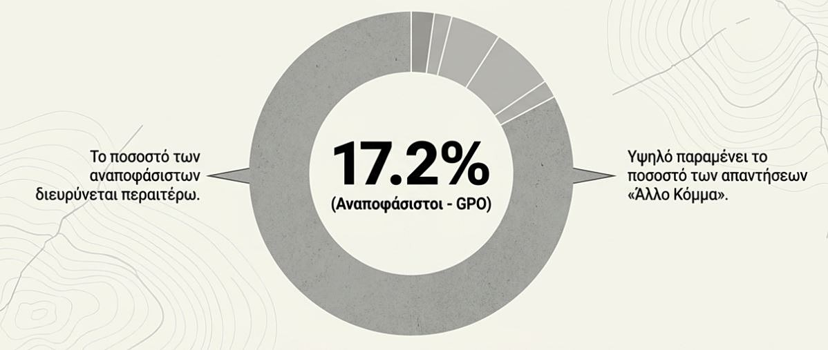 Το ποσοστό των αναποφάσιστων διευρύνεται ακόµα περισσότερο και φτάνει στο 17,2%, ενώ ψηλά παραµένει και το ποσοστό των απαντήσεων «άλλο κόµµα», µε τις αυθόρµητες αναφορές να εστιάζουν κυρίως στους υπό ίδρυση σχηµατισµούς της κ. Καρυστιανού και του κ. Τσίπρα.