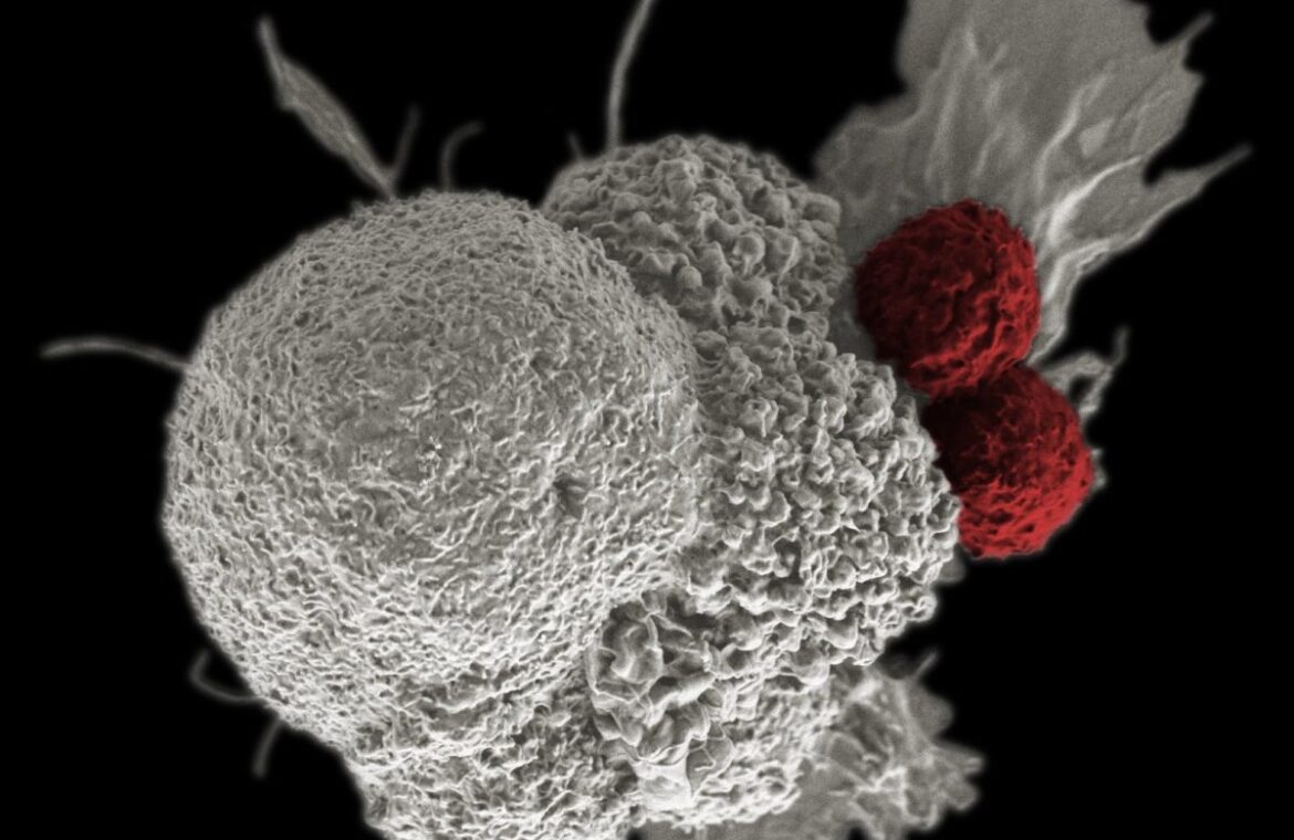 Τ-κύτταρα περικυκλώνουν ένα καρκινικό κύτταρο και ετοιμάζονται να του επιτεθούν