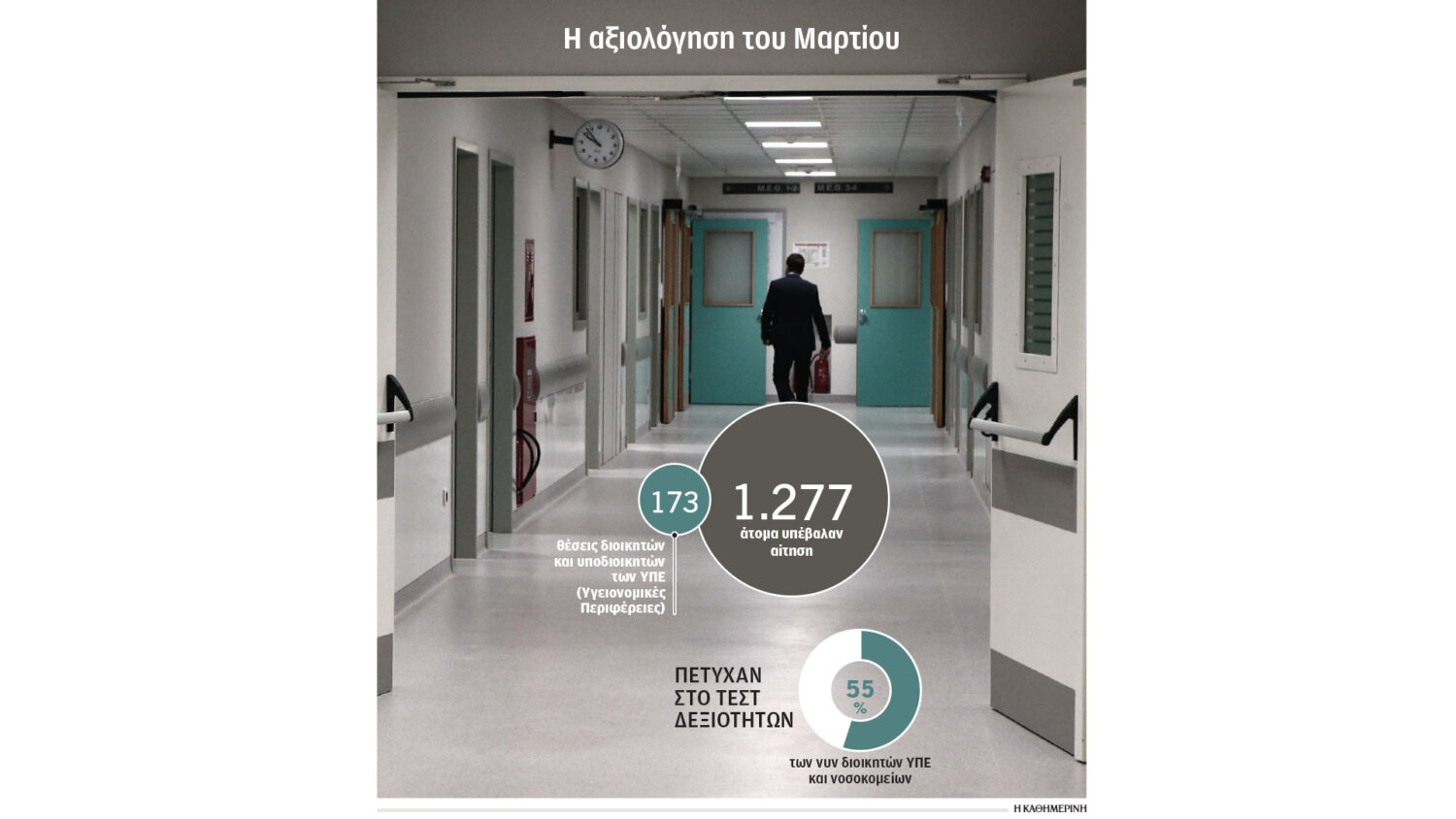 Ενας στους δύο ανθρώπους που κατέχουν σήμερα θέση διοικητή σε δημόσιες δομές υγείας δεν πέρασε τις εξετάσεις για την επαναπρόσληψή του στην ίδια ή παραπλήσια θέση μέσω του νέου συστήματος αξιολόγησης που ισχύει από τον Νοέμβριο του 2023.