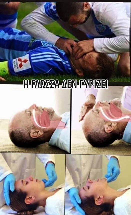 Ισχύει το περιβόητο«του γύρισε η γλώσσα»…;;;;Συχνά σε αθλητικές διοργανώσεις βλέπουμε αθλητές να χάνουν τις αισθήσεις τους και οι δημοσιογράφοι να περιγράφουν πως «λιποθύμησε και του γύρισε η γλώσσα”.Στην συνέχεια βλέπουμε διάφορους παρευρισκόμενους να βάζουν τα χέρια τους μέσα στο στόμα του θύματος προσπαθώντας να επαναφέρουν την γλώσσα στην θέση της..Η γλώσσα ΔΕΝ γυρίζει!Σε αναίσθητο άτομο όπως και οι υπόλοιποι μύες του σώματός, η γλώσσα χαλαρώνει και λόγω βαρύτητας πέφτει προς τα πίσω, αποφράσσοντας τον αεραγωγό.Η πρώτη φωτογραφία απεικονίζει τη γλώσσα που χαλαρώνει σε αναίσθητο θύμα και η δεύτερη πως απελευθερώνεται ο αεραγωγός όταν εφαρμόζουμε την τεχνική “έκταση της κεφαλής και ανύψωση της κάτω γνάθου”.Σωστή αντιμετώπιση:Ο αεραγωγός μπορεί να απελευθερωθεί εκτείνοντας το κεφάλι προς τα πίσω και ανασηκώνοντας το πηγούνι. Αυτή η ενέργεια τραβά τη γλώσσα προς τα εμπρός και μακριά από τον λάρυγγα, διευκολύνοντας έτσι τη δίοδο του αέρα.Τοποθετήστε το θύμα ανάσκελα, με την παλάμη του ενός χεριού σας στο μέτωπο του πάσχοντα, εκτείνετε ήπια το κεφάλι προς τα πίσω.Με τα δάκτυλα του άλλου χεριού, τα οποία έχετε τοποθετήσει στην κάτω γνάθο ανυψώστε το πηγούνι.Αυτές οι συνδυασμένες ενέργειες θα απελευθερώσουν τον αεραγωγό (έκταση της κεφαλής και ανύψωση της κάτω γνάθου) και θα επιστρέψουν την δίοδο αέρα (αναπνοή).Δεν χρειάζεται να ανοίξετε το στόμα του θύματος με τα χέρια σας είτε να βάλετε οποιοδήποτε αντικείμενο μέσα στην στοματική κοιλότητα (κλειδιά, κουτάλι, ύφασμα , δάχτυλο κ.ά).