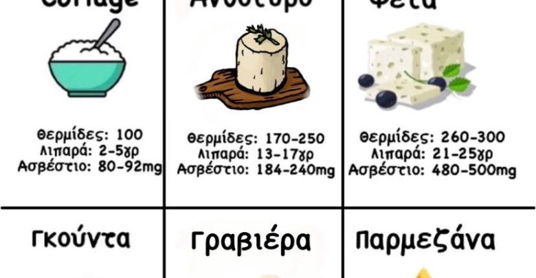 | Τυρί (Ανά 100γρ) | Θερμίδες (Kcal) | Λιπαρά (γρ) | Πρωτεΐνες (γρ) | Ασβέστιο (mg) |