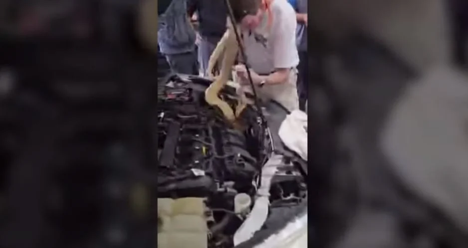 Σύμφωνα με την New York Post οι μηχανικοί εργάζονταν στο αυτοκίνητο όταν βρήκαν το μεγάλο φίδι να στριφογυρίζει κάτω από το καπό. Τότε ήταν που έφτασε στο σημείο ο Ράσελ Κάβεντερ, γνωστός ως “Κυνηγός Φιδιών”, ο οποίος και έβαλε τα χέρια του στο αυτοκίνητο για να απομακρύνει με ασφάλεια το φίδι, το οποίο φαινόταν να έχει κολλήσει.