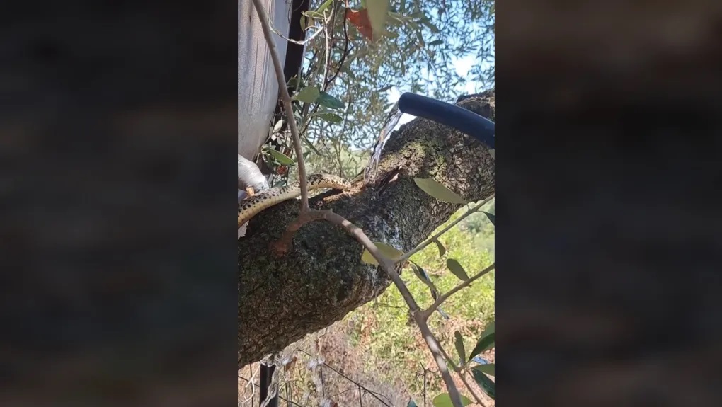 Σε αυτό καταγράφεται ένας άνδρας κάπου στην Ελλάδα να προσφέρει νερό σε ένα διψασμένο φίδι που βρίσκεται πάνω σε ελιά στο χωράφι του.