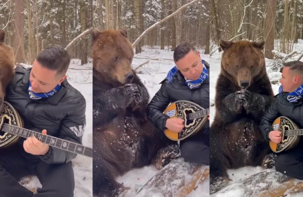 Η ανάρτησή του έχει αφήσει άναυδους τους διαδικτυακούς του φίλους, καθώς απεικονίζεται σε βίντεο, σε χιονισμένο τοπίο να παίζει συρτάκι με το μπουζούκι του και μια μεγάλη αρκούδα να κάθεται δίπλα του… γλείφοντάς του το χέρι αρχικά και έπειτα απολαμβάνει τις πενιές τρώγοντας ήσυχα ήσυχα το «γεύμα» της -που ευτυχώς δεν είναι ο Δημήτρης-.