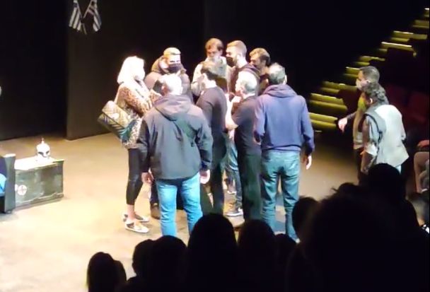 «Σας παρακαλώ» ακούγεται να λέει επανειλημμένα δια του μικροφώνου ο Χρ. Ζαραλίκος τη στιγμή που η σκηνή έχει γεμίσει με ανθρώπους και η ένταση είναι εμφανέστατη ενώ θεατές τους διώχνουν.