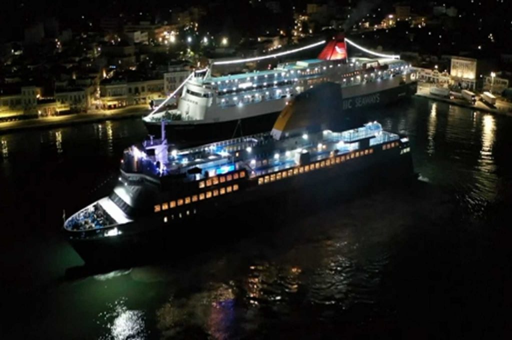 Τα δύο πλοία πρυμνοδέτησαν δίπλα – δίπλα σε απόσταση αναπνοής, ξεφορτώνοντας με ασφάλεια επιβάτες και οχήματα.