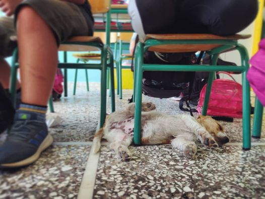 Αμέτρητα τα πλεονεκτήματα της δια ζώσης διδασκαλίας! Ένα από αυτά, η απρόσμενη επίσκεψη στην τάξη μας μιας αδέσποτης μικρούλας! Ήπιε, έφαγε, πήρε αμεεεέτρητα χάδια και …ονειρεύτηκε ανάμεσα στις σχολικές μας τσάντες! Τα παιδιά μιλούσαν ψιθυριστά για να μην την ξυπνήσουν 😏 !