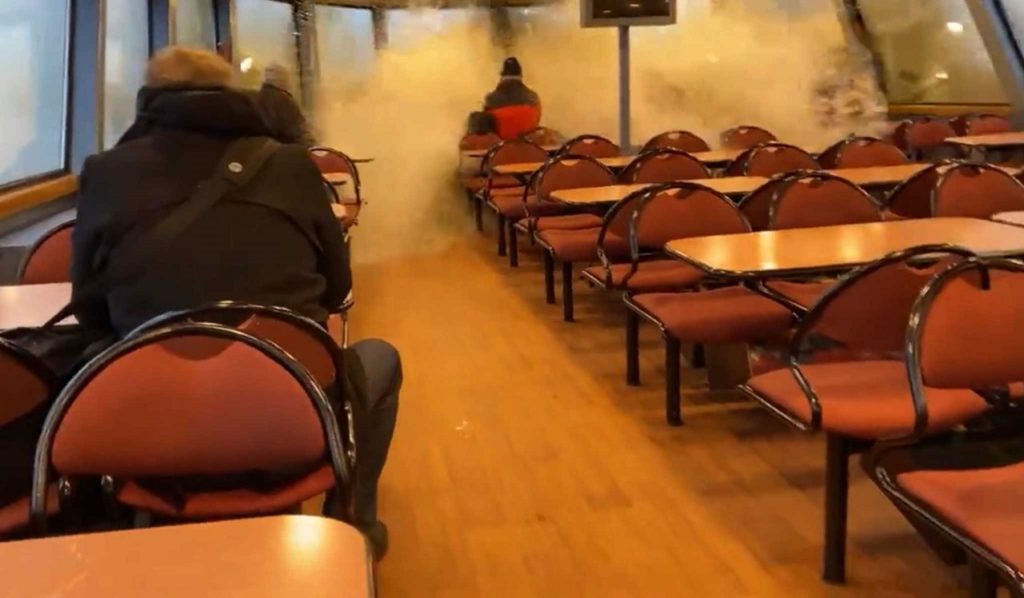 Τουλάχιστον τρεις επιβάτες φαίνονται να πέφτουν από την ορμή του νερού της λίμνης, ενώ δευτερόλεπτα αργότερα όσοι… έμειναν όρθιοι άρπαξαν όπως – όπως τα πράγματά τους και σηκώθηκαν για να φύγουν από το σημείο.