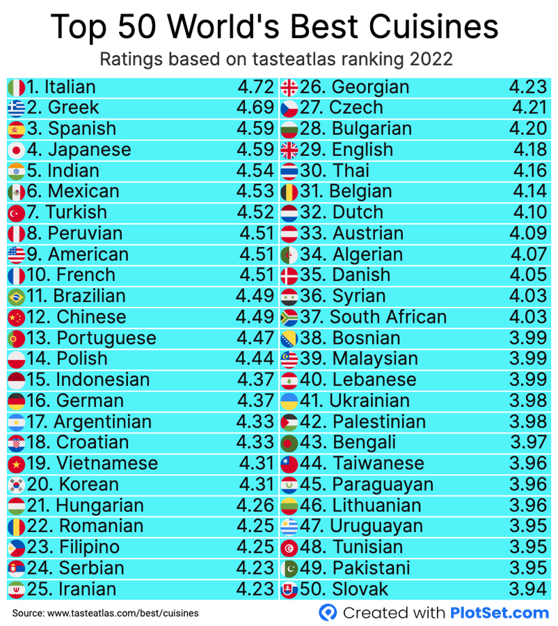Αυτό που αξίζει να αναφερθεί είναι ότι η ιταλική κουζίνα επικράτησε της αντίστοιχης ελληνικής, συγκεντρώνοντας 4,72 αστέρια.