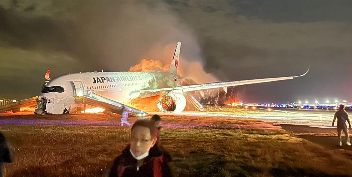 Πλάνα που μεταδόθηκαν ζωντανά από τον ΝHK δείχνουν το αεροσκάφος της Japan Airlines (JAL), ένα Airbus A350, να τυλίγεται στις φλόγες καθώς γλιστράει στο διάδρομο περίπου στις 18:00 τοπική ώρα.