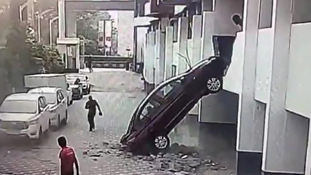 Όπως φαίνεται στο βίντεο, ένα αμάξι κατέληξε από το πάρκινγκ στο κενό, με τους επιβάτες αλλά και τους περαστικούς να κινδυνεύουν.