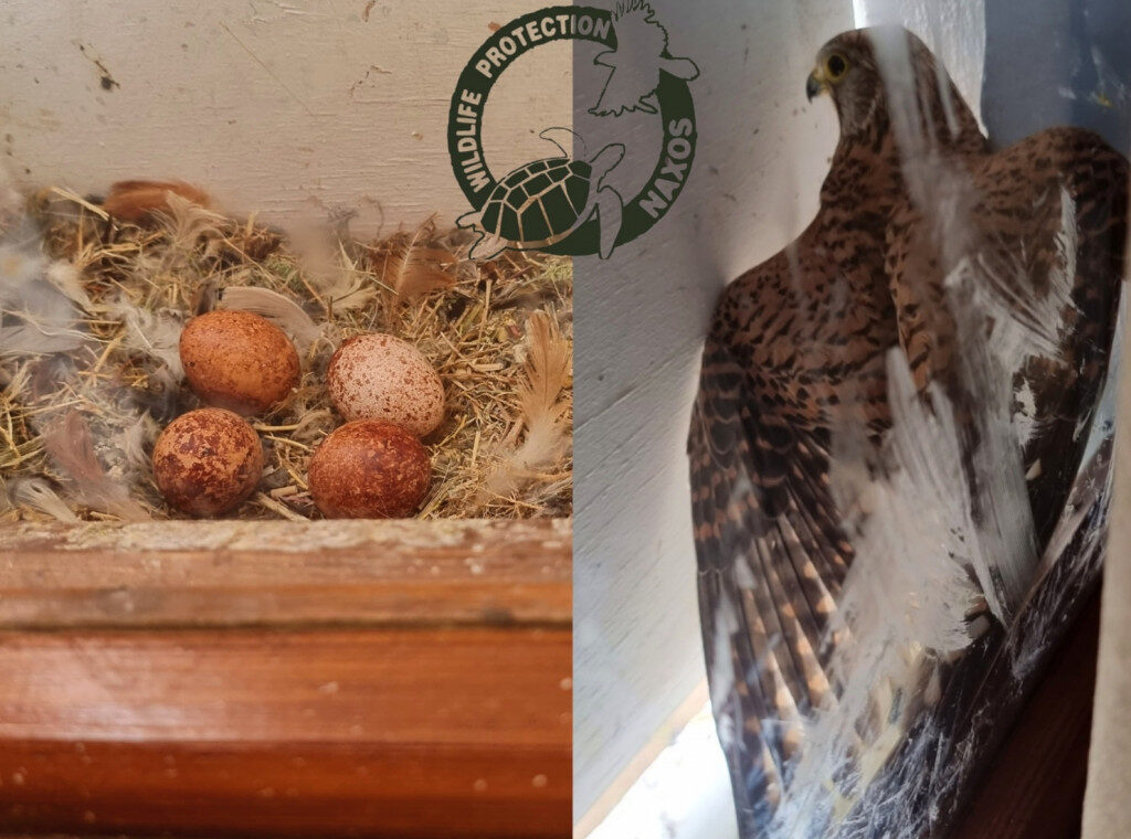 «…Ενημερωθήκαμε για ένα γεράκι που είχε γεννήσει σε ξενοδοχείο στο Καστράκι Νάξου. Πήγαμε στο ξενοδοχείο και όντως είδαμε ένα Βραχοκιρκίνεζο (Falco tinnunculus) το οποίο κλωσούσε 4 αυγά σε κλειστό παράθυρο δωματίου. Μετά την συζήτηση με τους ιδιοκτήτες δέχθηκαν με χαρά να κρατήσουν το συγκεκριμένο παράθυρο κλειστό και να βοηθήσουν με κάθε τρόπο και όσο χρειαστεί έως ότου φύγουν οι νεοσσοί».